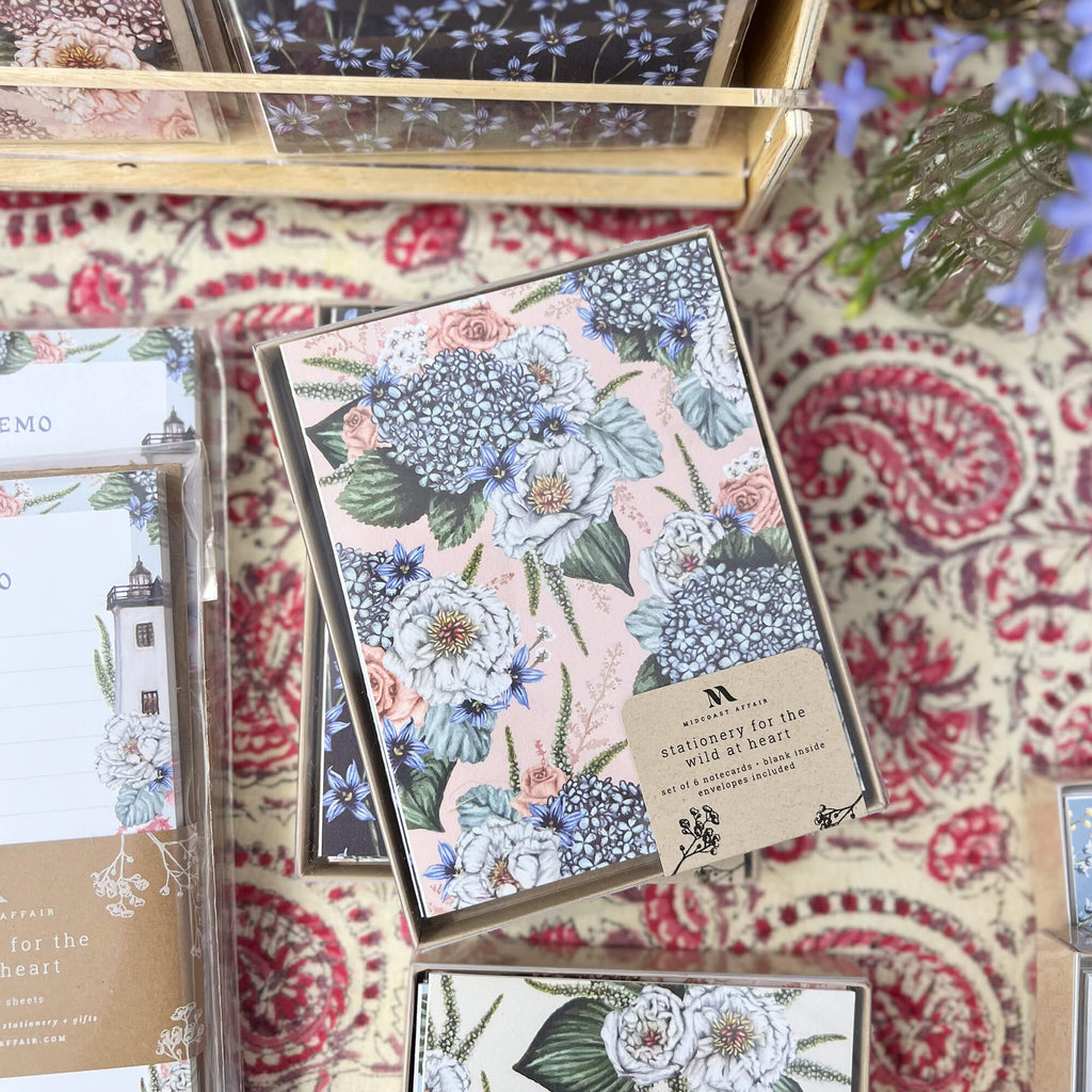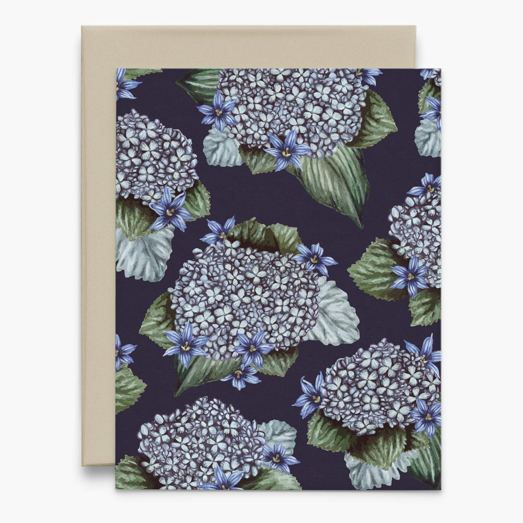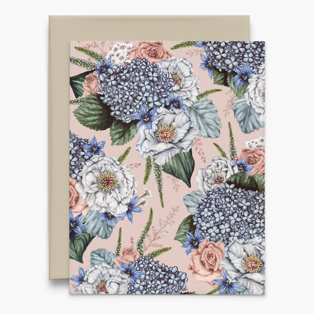 Everyday greeting card set with hand-illustrated hydrangeas, peonies, and blue-eyed grass flowers. Top card is picked at random for each set made per order. Each set includes: