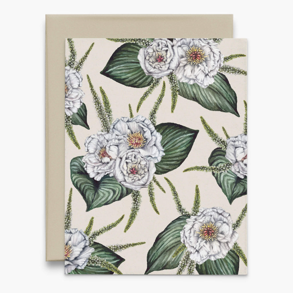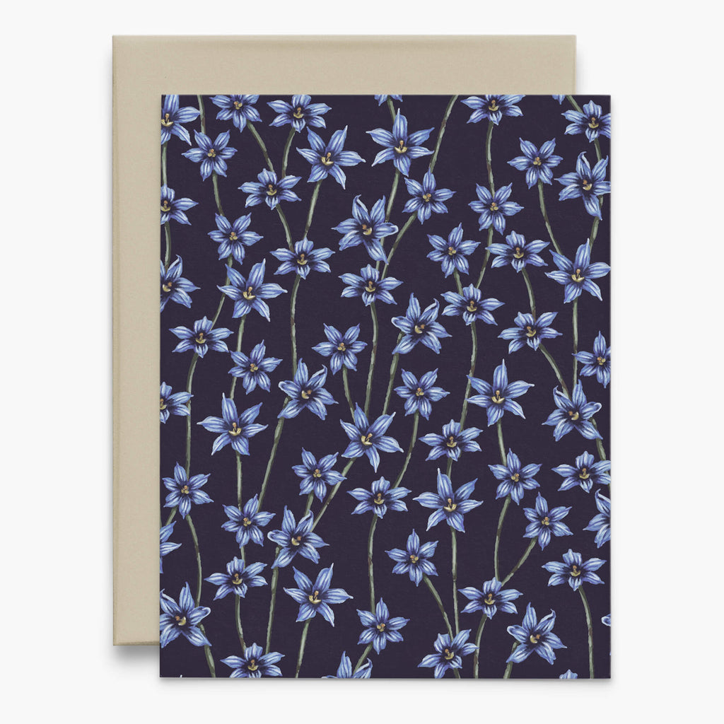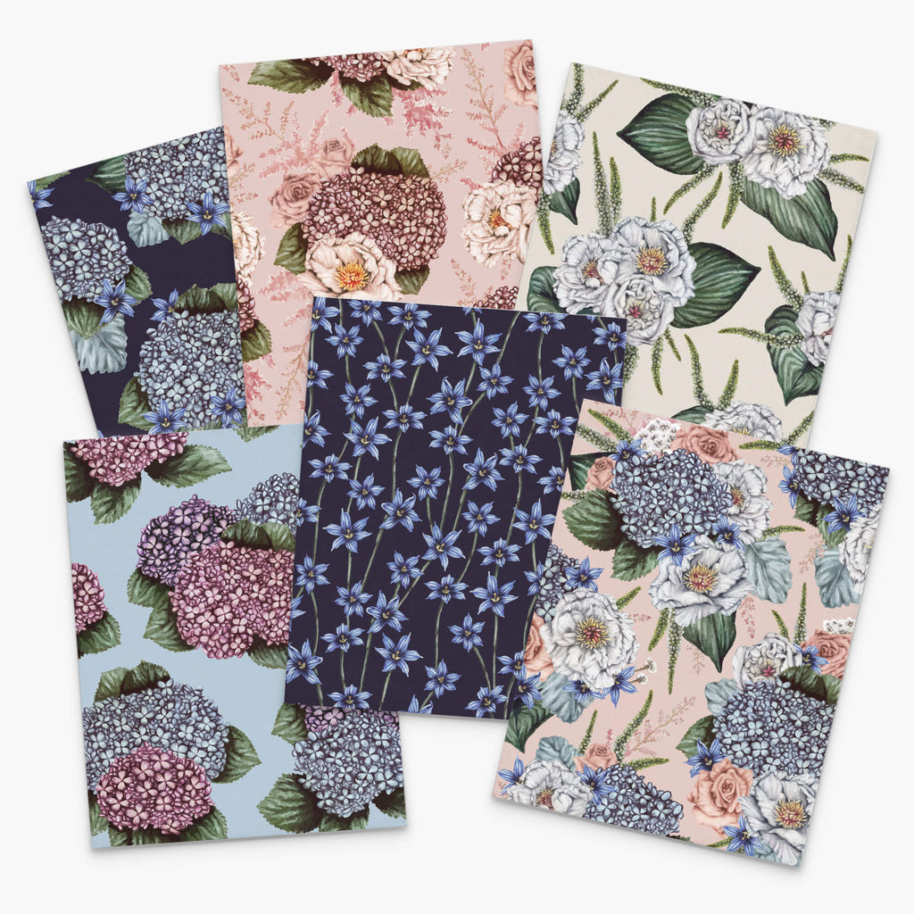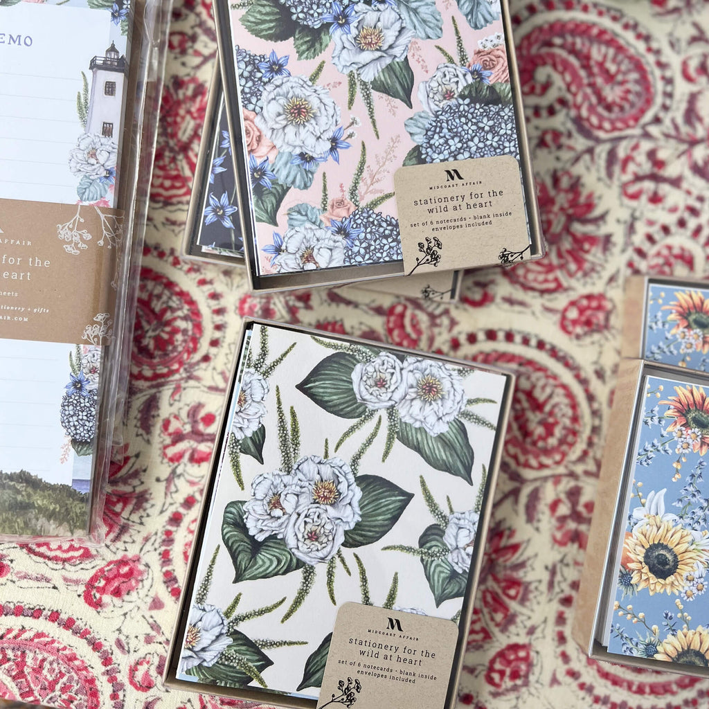 Everyday greeting card set with hand-illustrated hydrangeas, peonies, and blue-eyed grass flowers. Top card is picked at random for each set made per order. Each set includes: